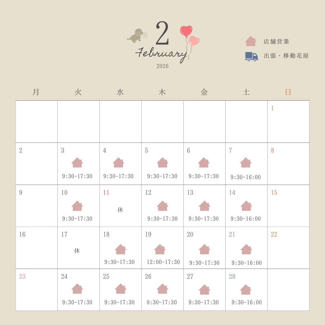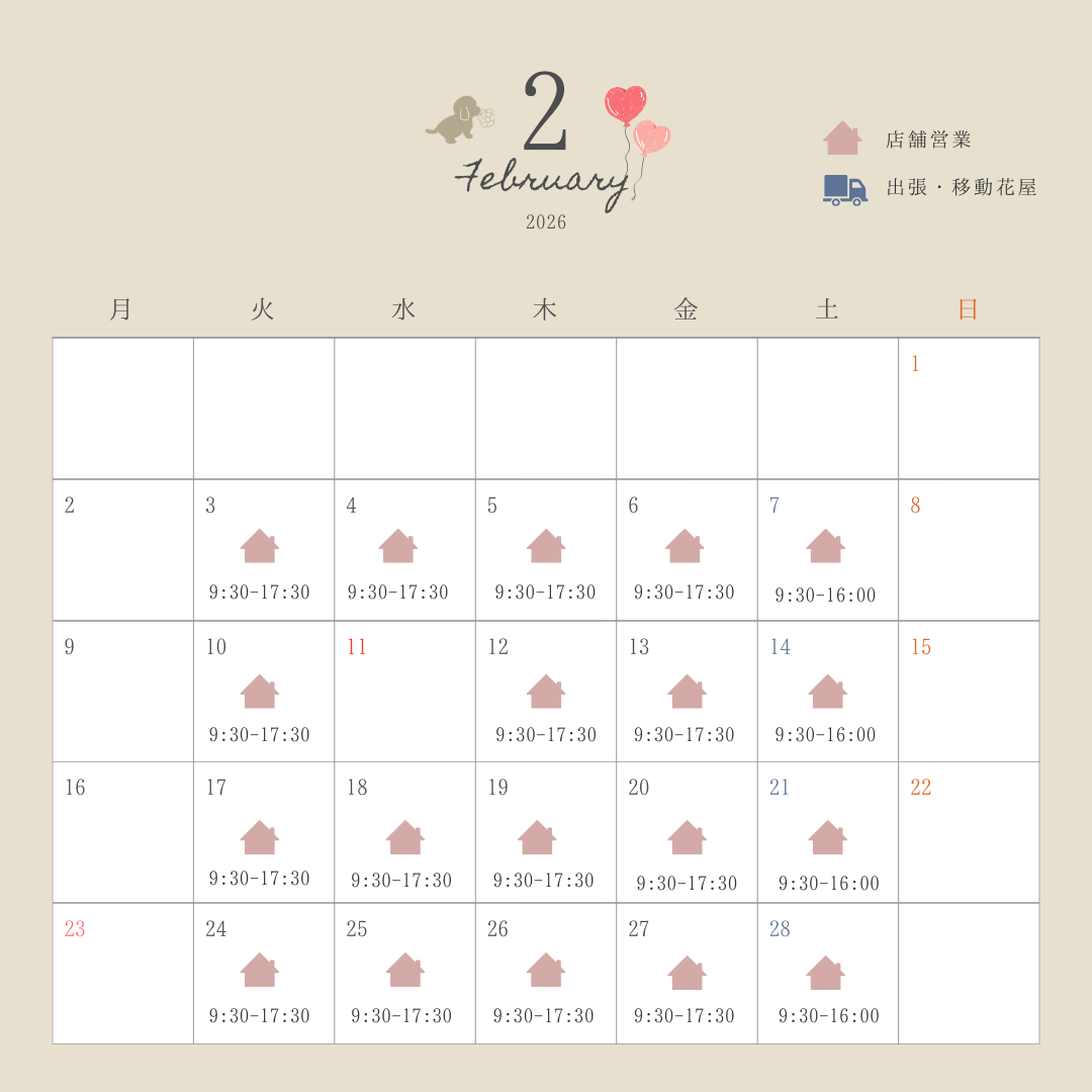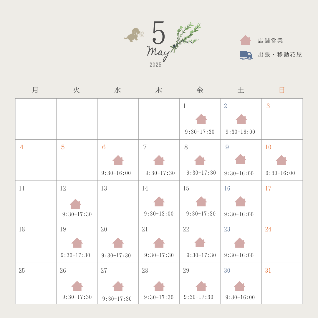 ※イベント出店や移動花屋の都合により、お休みをいただく場合があります。詳しくは営業カレンダーをご確認ください。