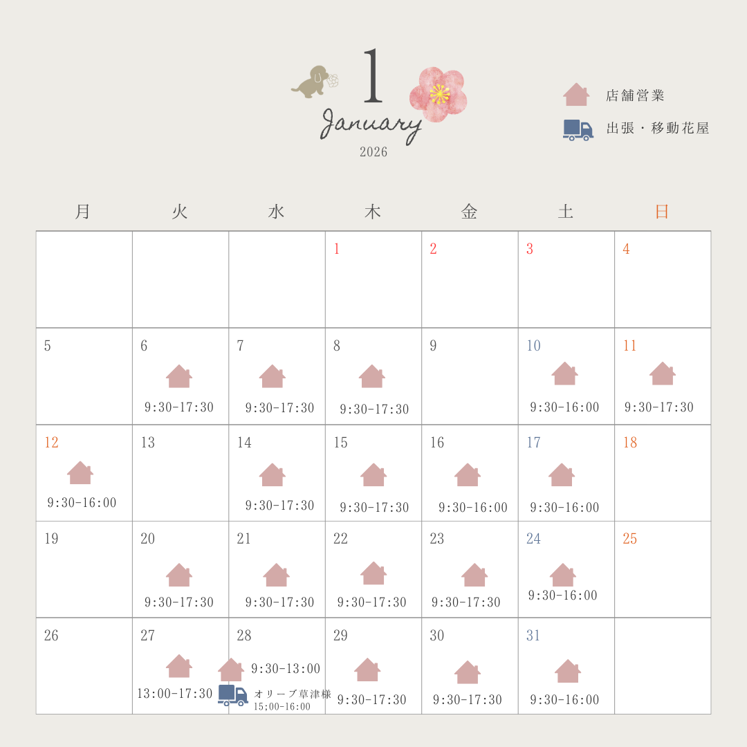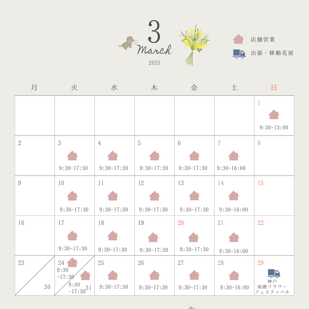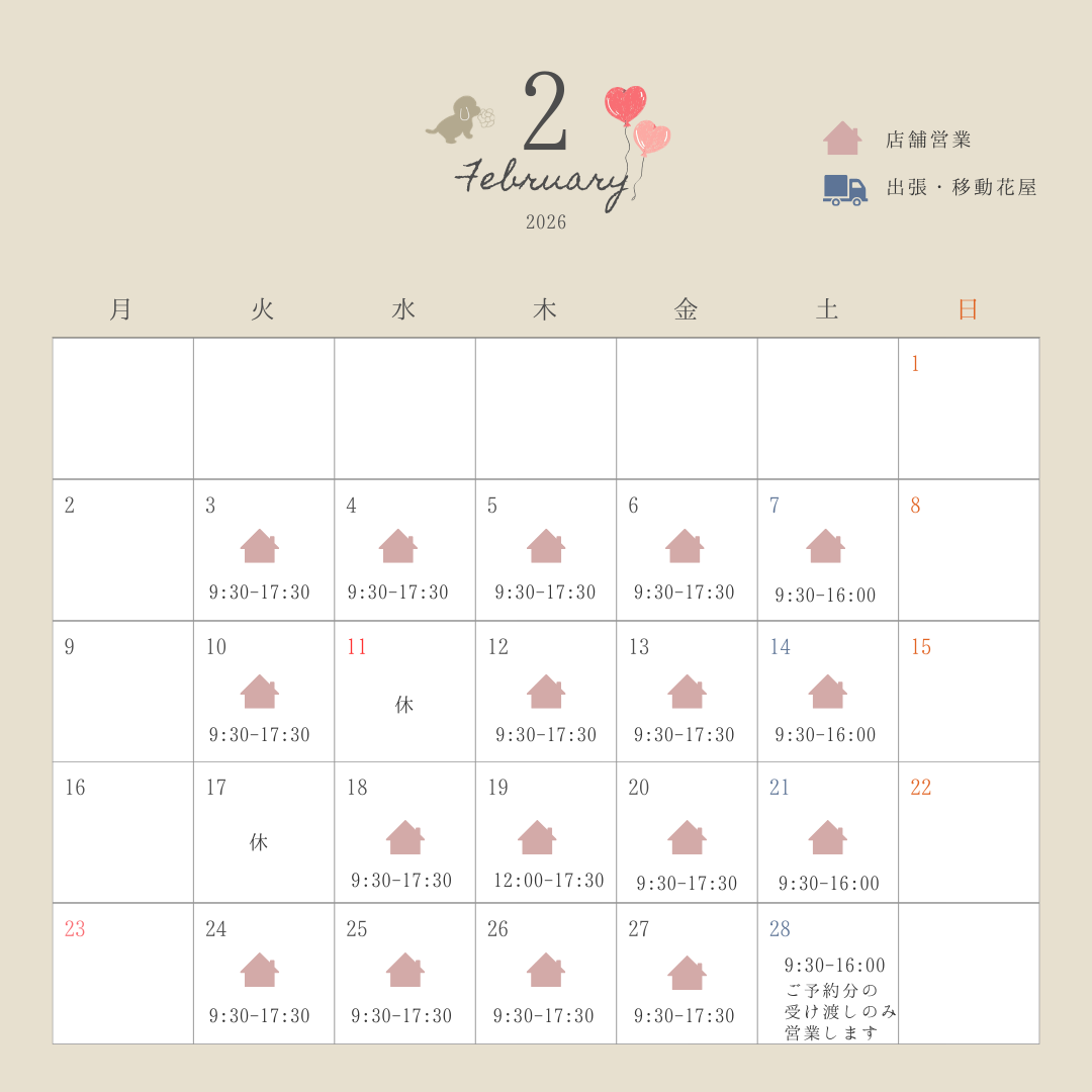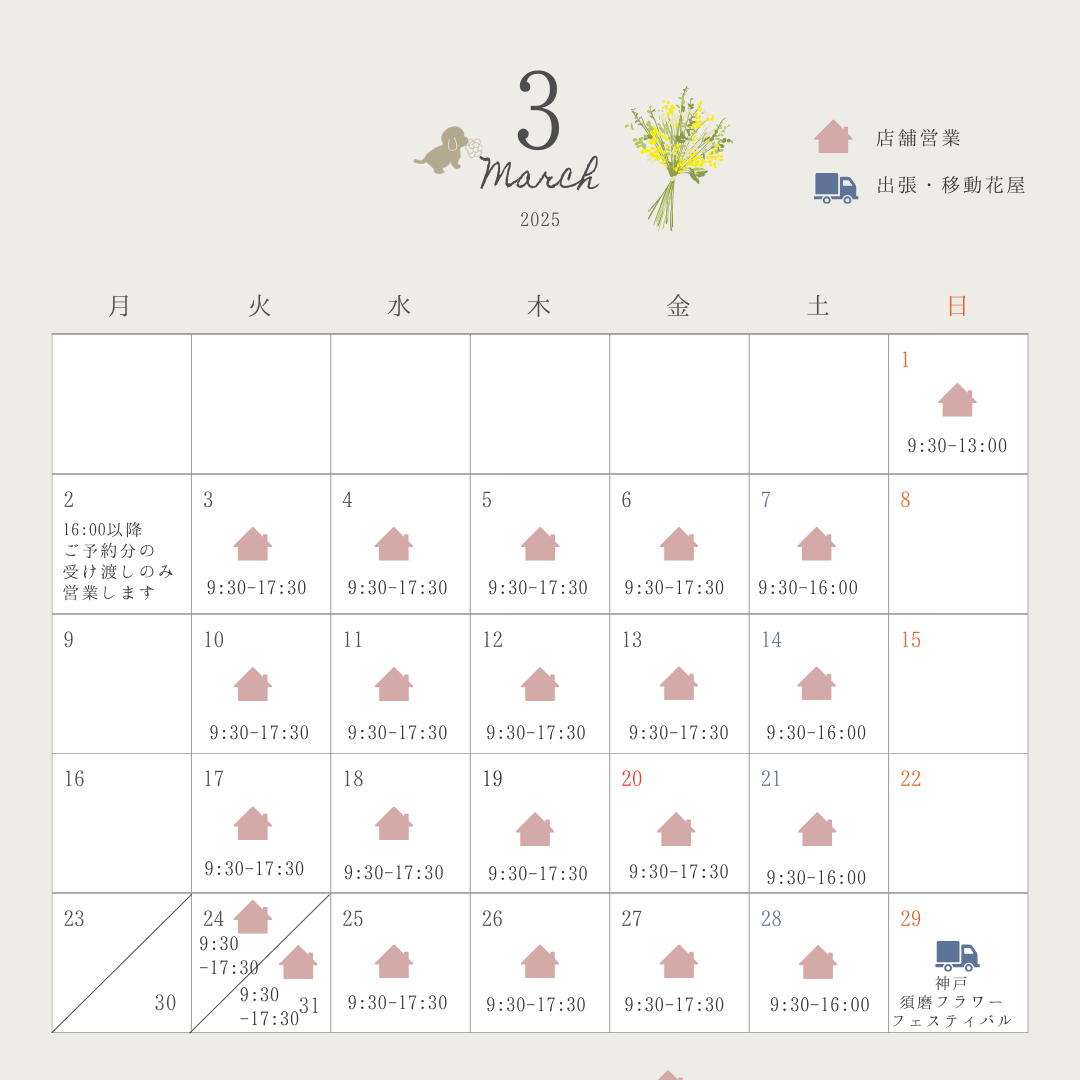 ※イベント出店や移動花屋の都合により、お休みをいただく場合があります。詳しくは営業カレンダーをご確認ください。