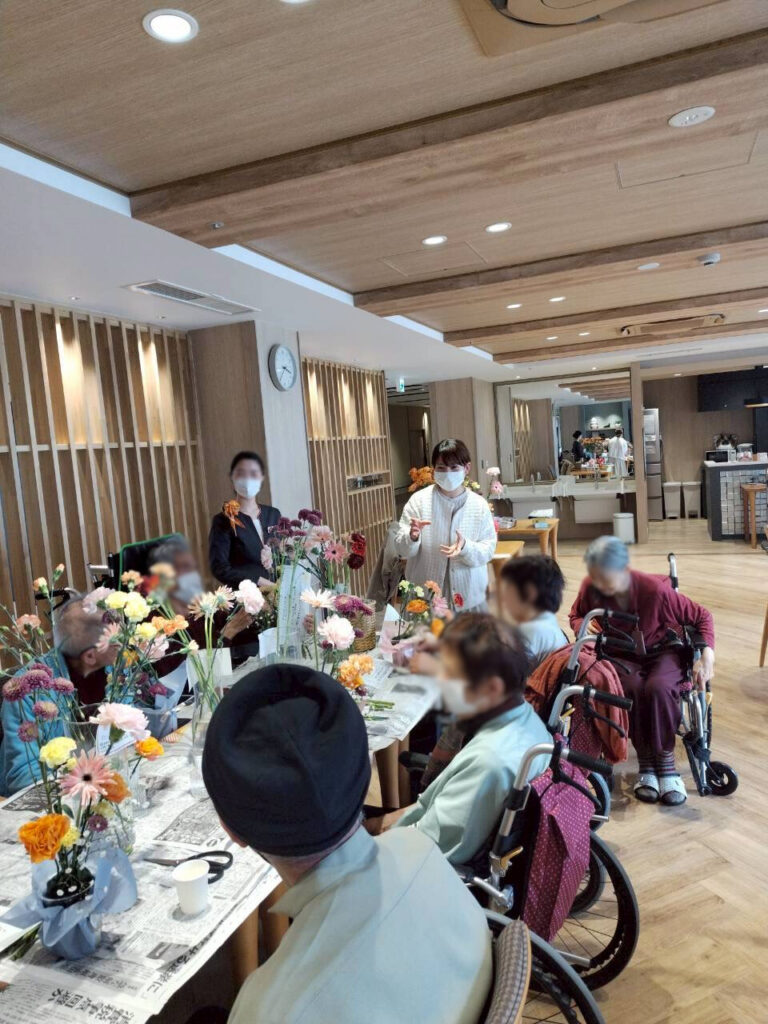 お花を車に積み、介護施設やデイサービス、ご自宅へ伺いその場で販売させていただきます。訪問先での花束・アレンジメント教室も行っています。